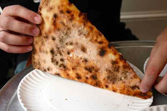 - Check for char. If the crust on the slices in the display case are not well-charred, nicely puffed, and spotty brown, move along.