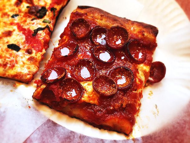 - Prince Street Pizza took over the space that the real original Ray's Pizza used to occupy, and they gave it a huge upgrade in terms of pizza quality. Their "Spicy Spring" square pie made with Fra Diavolo sauce, spicy pepperoni (real natural casing stuff, the kind that cups up into glorious little crisp-lipped grease chalices as it cooks) and mozz gets an insanely crisp, olive-oil-saturated bottom, making it one of my favorite slices in the city.