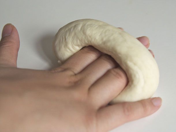 A note on hand size: The recipe calls for wrapping the rope around your palm, but I like a smaller, tighter bagel, so I wrap it around my first three fingers, as shown. If you have a smaller hand, you could probably wrap it around all your fingers.