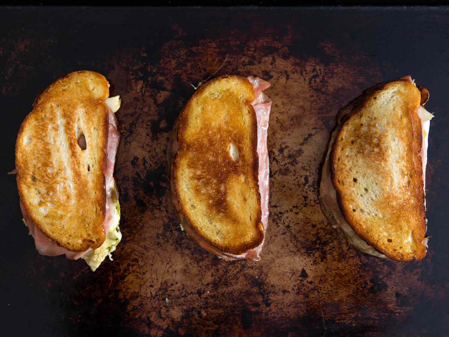 It starts with thin slices of a dense white bread, like a country loaf. You don't want bread with big air holes in the crumb, or your filling may just seep right out. One of the defining characteristics of this grilled-cheese method is that the bread is toasted on both sides. Here, I toast it in olive oil instead of butter, since olive oil's flavor makes more sense with these Italian fillings.