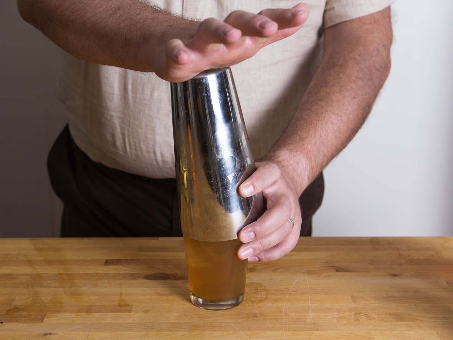 4. Seal the shaker. To close the shaker so that it doesn't leak when you're shaking, you need to ensure a tight seal. Place the empty metal mixing tin over the top of the filled shaker at a slight angle. Using the heel of your hand, tap sharply against the base of the tin. You don't need to hit the tin hard, just firmly. If you've sealed your shaker properly, you should be able to pick the entire contraption up from your counter or table just by lifting the tin. If you lift the top tin and the base stays on the table, you don't have a seal.