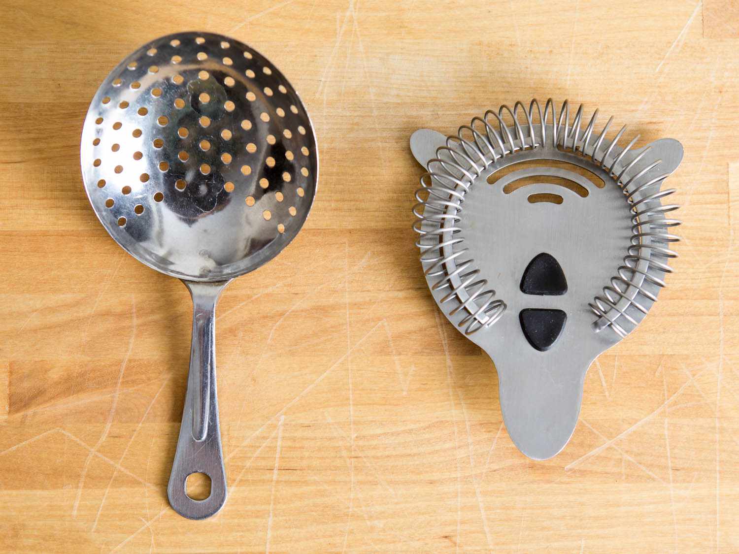 As with shakers, there are a couple of commonplace types of strainers. The first is known as a julep strainer, and it has a perforated, bowl-shaped cup attached to a handle. By and large, though, we prefer the Hawthorne strainer, which consists of a flat disk affixed to a coiled spring. The spring traps large chunks or slivers of ice and other solid ingredients, such as muddled fruit or mint leaves. The spring also allows you to control the flow of liquid from the shaker, and the strainer does a generally excellent job of keeping small ice chips, citrus pulp, and particles of muddled ingredients in the shaker, where they belong.