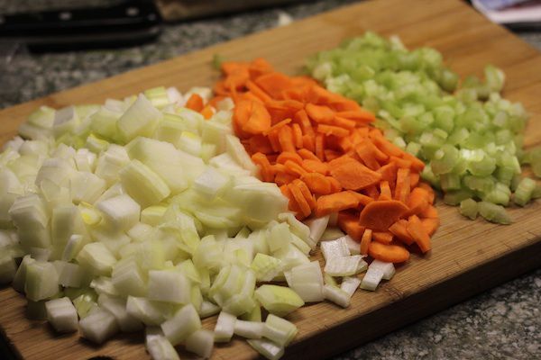 In this slideshow, I’m sweating mirepoix, a classic combination of two parts onion, one part carrot, and one part celery. Mirepoix and its variants (parsnips instead of carrots, leeks instead of onions) form the basis of many braised dishes, soups, and sauces. Your recipe might also call for other aromatic vegetables like peppers, ginger, mushrooms, or fennel. Whatever vegetables you use, they should be cut into roughly the same size so they all sweat at about the same rate.