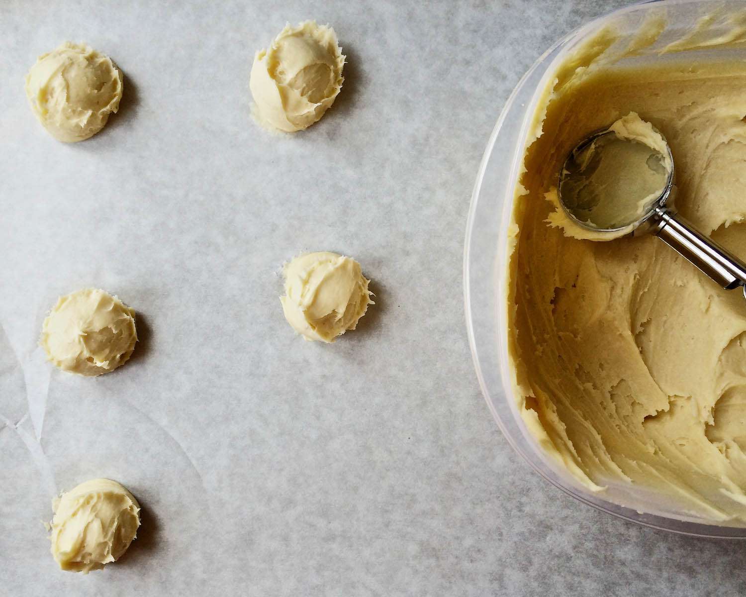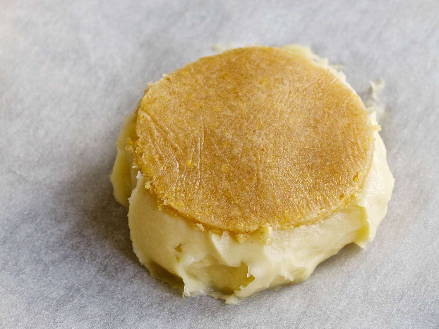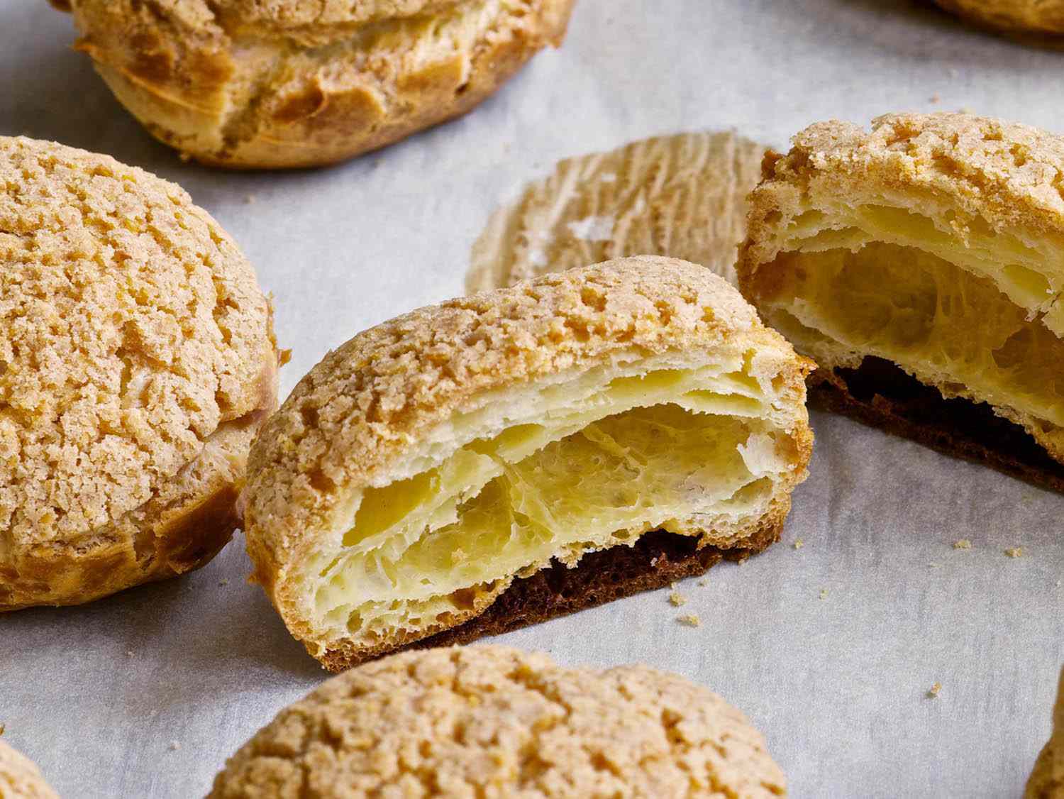But we weren't done quite yet. We also wanted to enhance the texture of the choux pastry, so we decided to add craquelin to the puffs. Craquelin is often used in French pastry shops to add a crunchy topping to their baked sweets. The dough is a blend of butter, sugar, and flour, and resembles cookie dough or streusel. For our craquelin, instead of using all-purpose flour, we went for something even more flavorful: cornflakes. Their distinctive taste and crunchy texture add yet another dimension to these puffs.