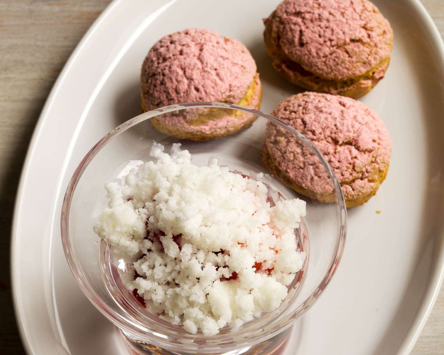Once we settled on the choux pastry, we began wondering about flavor. Choux pastry is rarely flavored, and when it is, the additions tend to be savory (herbs, cheese, bacon) rather than sweet. Instead of stuffing the choux with little pieces of flavorful ingredients, we thought it would be cool to infuse the pastry with flavorings that aren't immediately visible, so that the first bite would bring a wonderful surprise. Our solution was to use aromatics like fresh ginger and lemongrass, that complement and enhance the berry's flavor. Basically, a little bit of herb and spice to lend some balance to that sweetness.