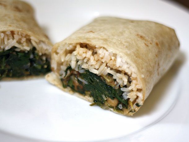 Basically, this is just a flavorful channa saag and white rice, all wrapped up in a tortilla. The spinach and chickpea mixture is fragrant with garlic, ginger, cumin, and garam masala, while a chopped tomato gives it body. One jalapeño helps lend a slight heat, though if you could definitely add a second one if you'd like. A drizzle of lime at the end lends acidity.
