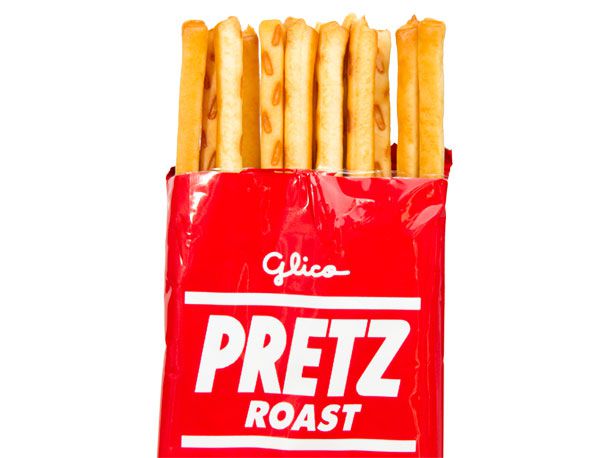 The savory, creamless version of Pocky, Pretz are also made by Glico, presumably in the exact same long-skinny-cylindrical biscuit factory.