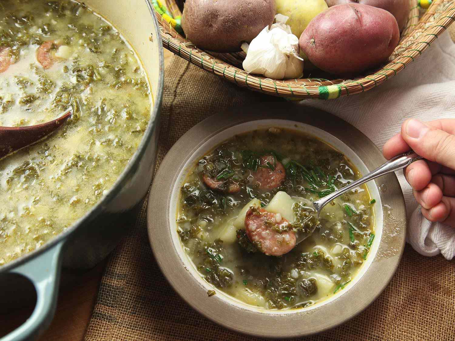"So, what's this soup? Just potatoes and kale simmered together until they're mushy? Hmm. Sounds boring," is what you might be saying to yourself in your head. And yeah. Potatoes and kale sounds kinda boring to me too. Yet when you actually cook up this classic Portuguese soup (and okay, it also gets some onions, chicken broth, and, if you're so inclined, some chouriço), you'll watch as those chunks of potato slowly break down and thicken up the soup while the kale reveals flavors you never knew it had. It all transforms into something comforting and hearty without being overly heavy.