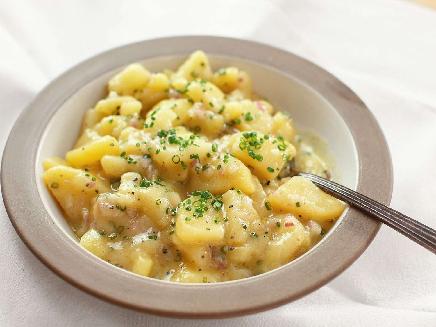 One problem with making Austrian potato salad in the United States is that it's impossible to find those uniquely sweet and earthy yellow Austrian potatoes, but I've found that so long as pure authenticity of flavor is not your goal (authenticity is way overrated), some good American potatoes can make a salad that's equally tasty, if a little different.