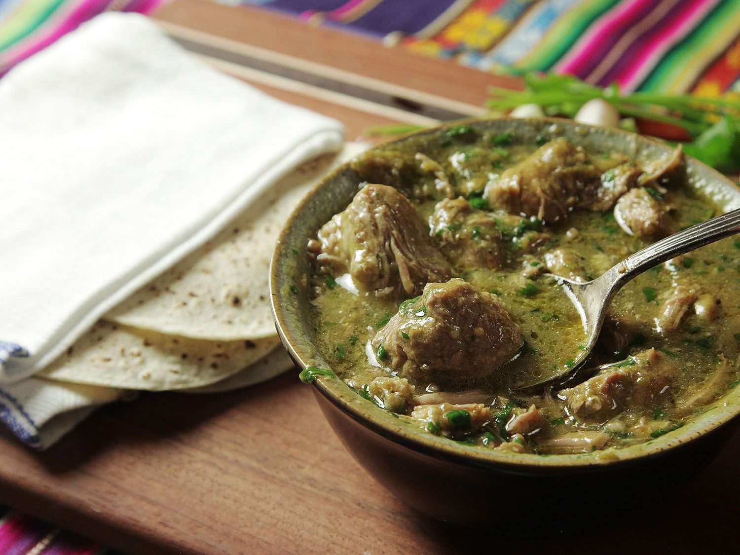 This is a bright green version of the classic Mexican meat-and-hominy soup. Made by combining several green ingredients (tomatillos, chilies, cilantro, pepitas, etc.) along with chicken and hominy, it all comes together in a single pot. The trick is adding things in the right order and at the right time in order to maximize the flavor of each ingredient and layer them into a cohesive whole.