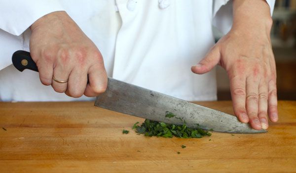 A fine mince requires the use of your free hand. Place the tip of your knife on the cutting board and hold it in place with your free hand. Rock the blade up and down to reduce herbs (or anything else) to a fine mince.