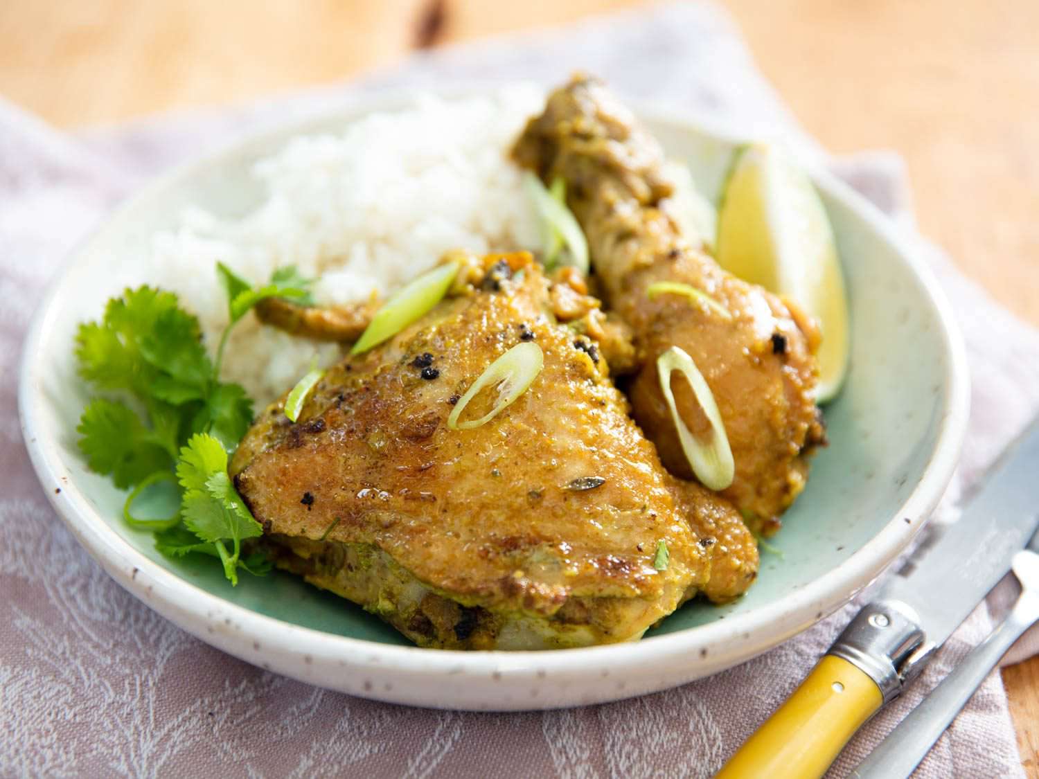 2. Transfer the purée to a large mixing bowl. Add curry powder and turmeric, then add chicken and marinate, covered, overnight or up to 24 hours in the refrigerator.