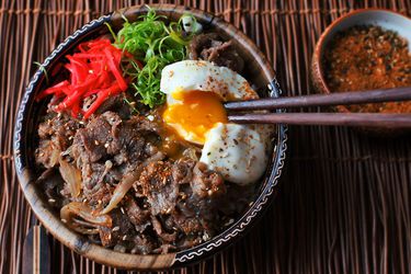 Lay 1 nori sheet on a bamboo mat lined up 1 inch away from the edge closest to you. Keep the shiny side of the nori facing down and the indentations running vertically. (For easier clean-up, cover the mat in plastic wrap.) Moisten your hands with water and gently spread about 1 cup (5.5 ounces;150g) of sumeshi evenly along the nori sheet, taking care not to compact the rice, and leaving a 1/2 inch boarder along the top and bottom of the nori sheet. Place your chosen filling along the lower third of the nori. Do not overstuff.