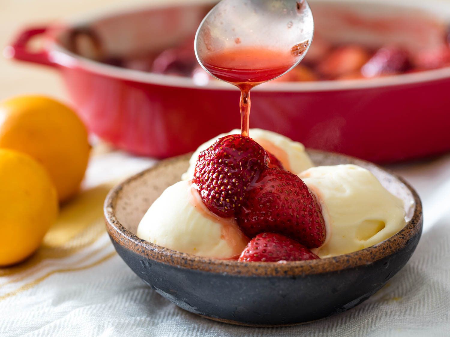 With or without the warm strawberries, if you make this ice cream at home, be sure to save the juiced and zested lemons for a batch of no-cook lemon syrup. It's a low-effort way to get the most out of pricey Meyer lemons, and a delicious topping for everything from waffles to French toast, as well as an ingredient in recipes like lemon poppy seed dressing, candied pistachios, and lemon chantilly. It's like a buy-one-get-one-free deal for dessert.