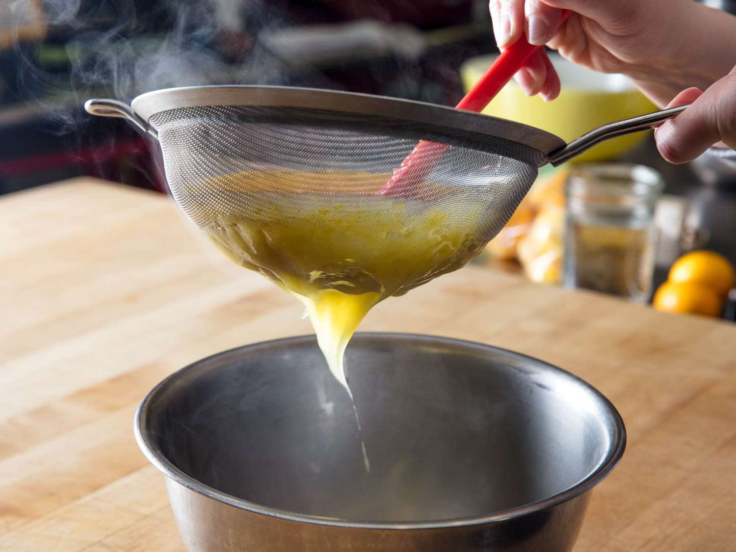 Next, I strain the base through a non-reactive sieve to remove the zest, which would otherwise form a congested knot between the paddle attachment and the bowl during the churning process. The act of straining also kickstarts the cooling phase, which I speed along with the addition of heavy cream straight from the fridge.
