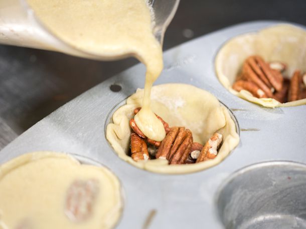 Sprinkle the cooled pecans into the chilled shells (about 1/3 of the way up in each shell). Pour the custard mixture over the pecans, filling each cup up almost all the way to the edge.