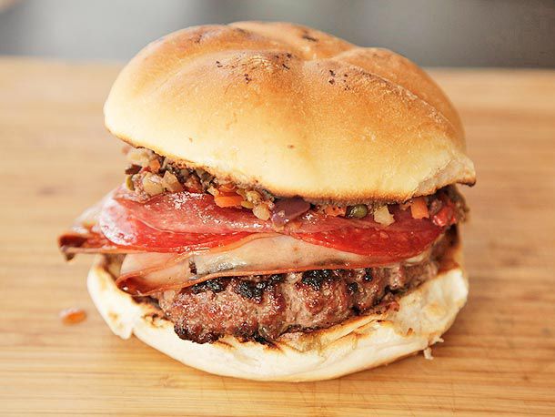 The key to a great muffaletta burger (aside from excellent olive salad, of course!) is to top the burger with the cold cuts and finish it off over the cooler side of the grill. Rendered cured fat slowly renders, dripping over and around the burger, flavoring every bite.