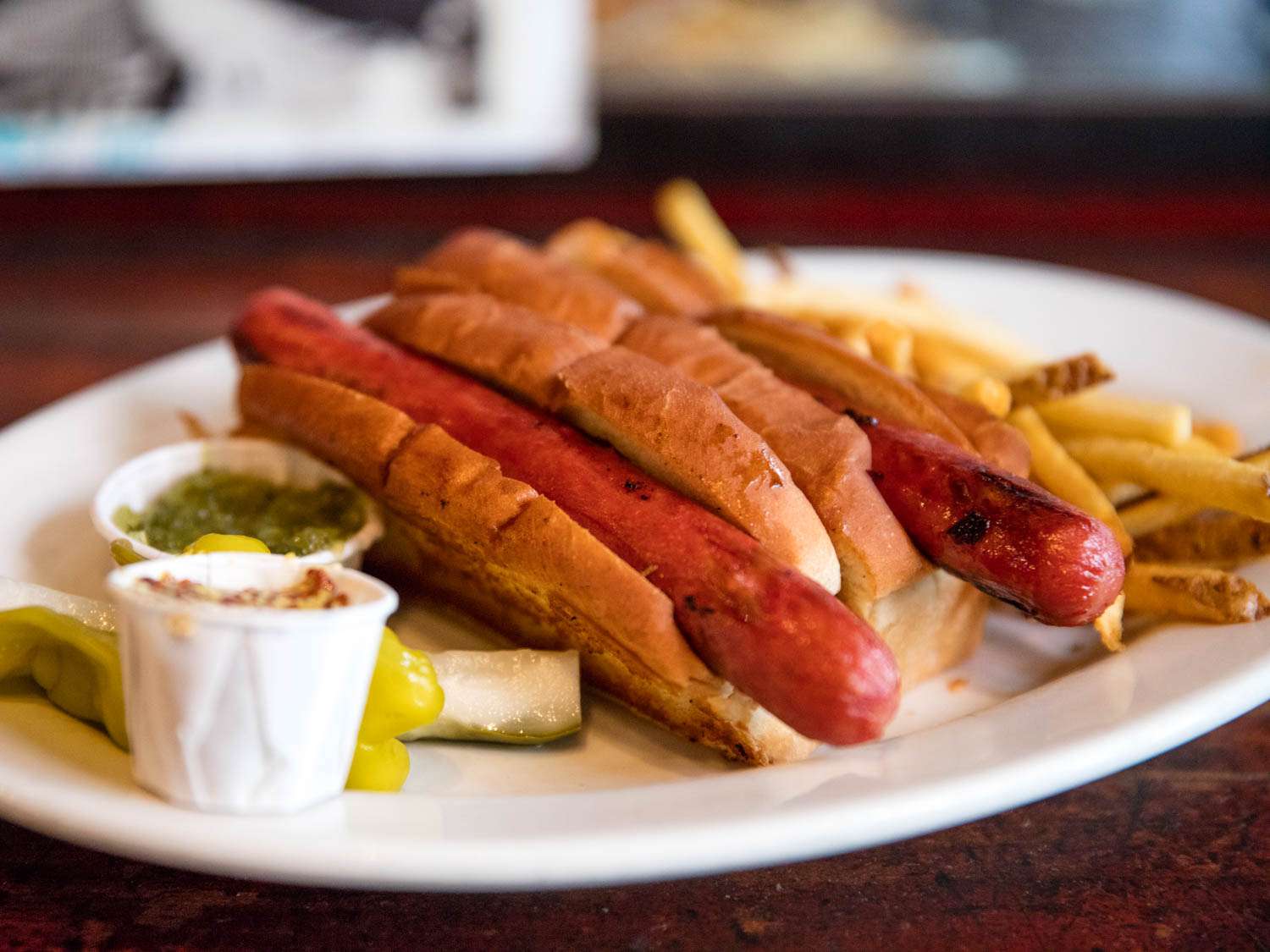 That's the beauty of a Massachusetts hot dog. Born of local chain restaurants, it is made of humble ingredients tweaked to achieve greatness: a juicy hot dog, sized in the ideal proportion to a perfectly constructed bun, buttered and crisped. There is nothing more and nothing less to the equation. You don't need the makings of a salad, wacky bacon-wrapped gimmicks, a seaside stand, or a cut-rate price for them to be good. New York hot dogs have their own kind of beauty—they can be grabbed quickly, eaten while speed-walking to a meeting or barely standing after a long bout of bar-hopping, and they're priced so that you can't complain. But a Massachusetts dog is meant to be savored, preferably seated in a booth of a small-town restaurant with little busy-ness in sight.