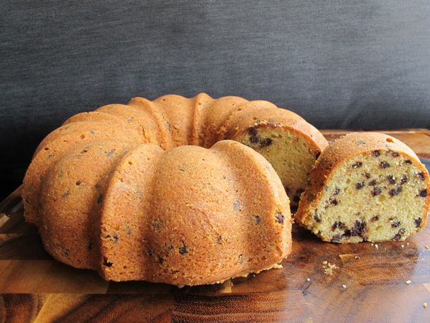 For this recipe, I was inspired by one of the most classic cookies of all time: chocolate chip. I wanted a simple bundt cake but one whose flavor went beyond simply a vanilla cake with chocolate chips. To achieve that, I used a combination of butter, brown sugar and baking soda—which adds an ever so slight soapy edge that I like in a chocolate chip cookie. The steps are easy: make a creamy paste out of the butter and sugar, then whisk in rich sour cream and eggs until combined (confession: I crack 'em right into the bowl). When it's time for adding the dry ingredients, simply add them right into the bowl and then mix. I know you might think I'm crazy for not whisking or sifting the dry mix separately first, but it works. If I see any lumpy bits of leavener, I just squish them out.
