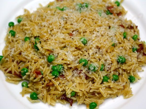 First off, this recipe from Epicurious is actually called "orzo carbonara," but I slipped in the "style" because this version is missing one absolutely essential ingredient (egg) and includes one that most experts agree shouldn't be there (cream).
