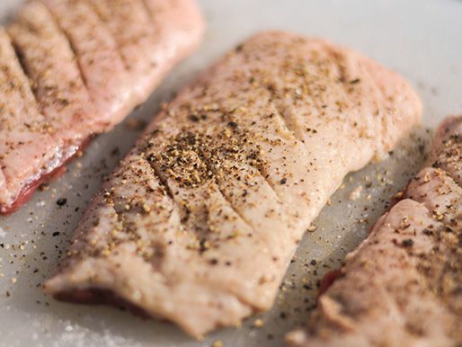 Using a sharp chef's knife, make 1/8th-inch deep scores on the duck skin diagonally every 1/2-inch. Season generously with salt and pepper on all sides.