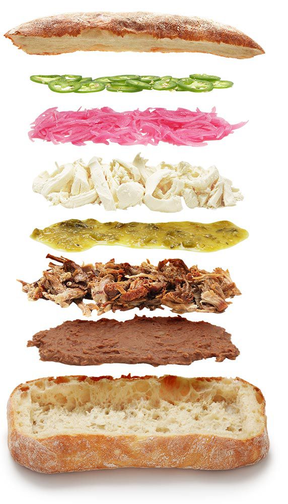 Mexican tortas are delicious, but messy. This sandwich, inspired by the same flavors, solves that problem by packing them all into a bread boat and pressing them under heavy weights until they form a single, intensely flavorful package with juicy pork, pickled onions, jalapeños, beans, and gooey melted Oaxaca cheese.