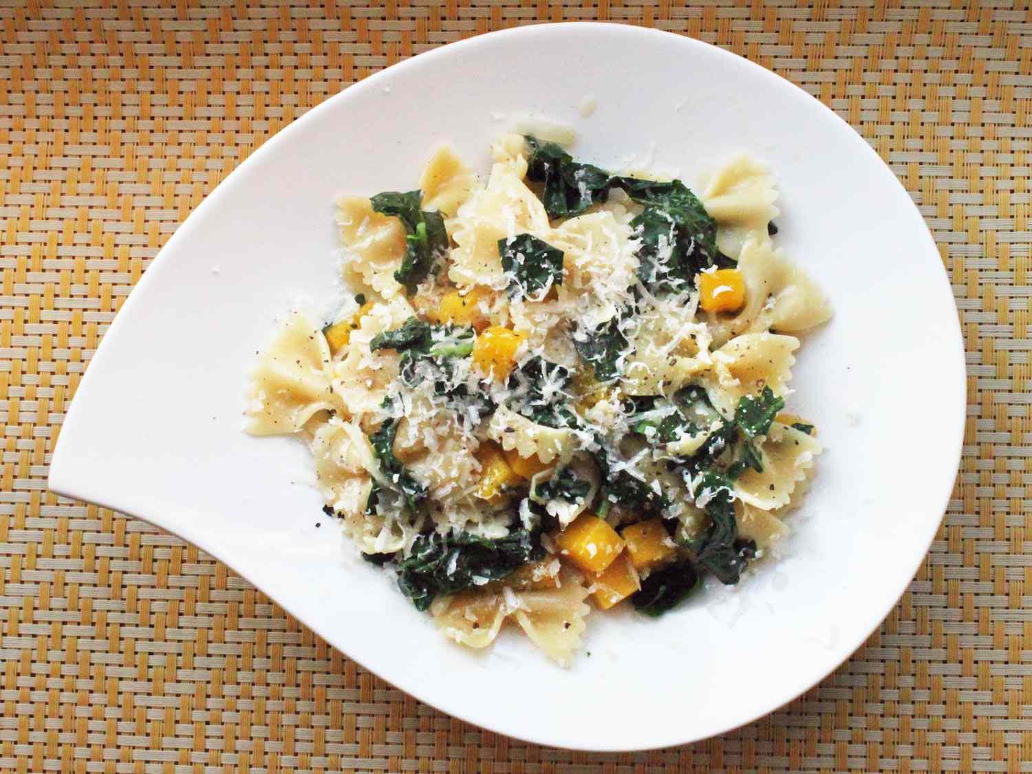 If you're short on time, sautéing cubed squash on the stovetop is a great way to add a little color and flavor without nearly as much effort as roasting entails. Once you've got the pumpkin cut up, this one-pot pasta dish is a breeze to make. The pasta goes straight into the skillet with the browned squash, followed by hearty lacinato kale, which cooks until wilted. To finish, just drizzle with olive oil and sprinkle with Parmigiano-Reggiano right before serving.