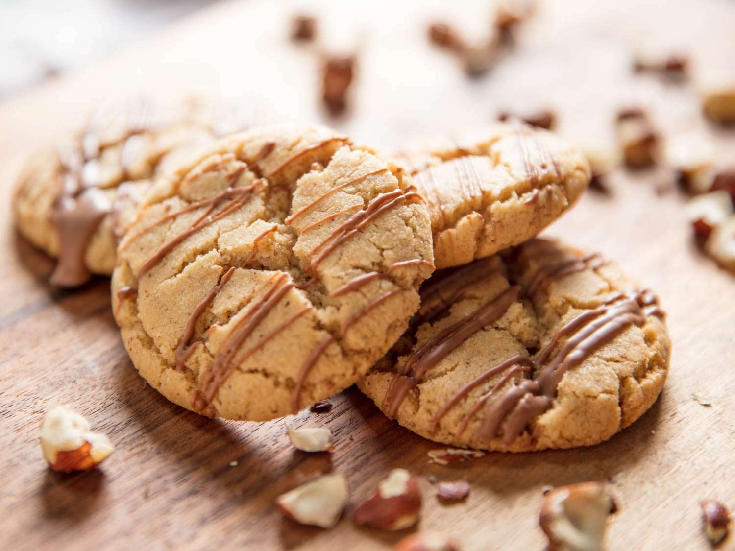 Store-bought hazelnut butter costs a lot and often has a lackluster flavor, so we grind our own from toasted hazelnuts. From there the recipe is like a peanut butter cookie—cream the hazelnut butter with unsalted butter, sugar, salt, baking powder, baking soda, and nutmeg, beat in an egg, incorporate the flour, and the dough is ready to go. A drizzle of tempered milk chocolate finishes the cookies beautifully, but if you're feeling lazy, you can just stir chopped chocolate into the dough.