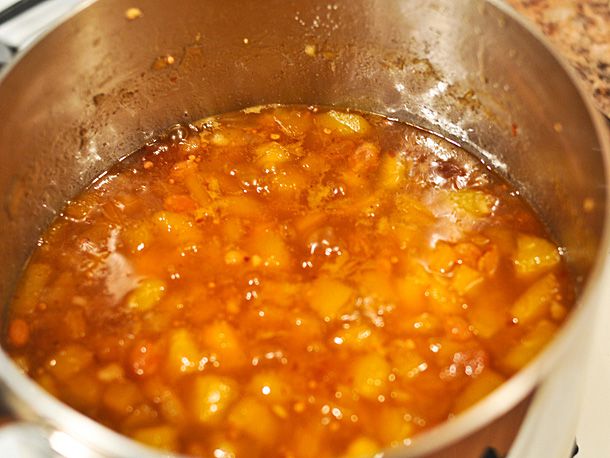 To make this, I slowly simmered mangoes, ginger, garlic, and onions along with some red pepper flakes, salt, and garam masala in a mixture of one part vinegar to two parts sugar. It took about an hour for the mangoes to fully soften and the sauce to reach the thick, syrupy stage.
