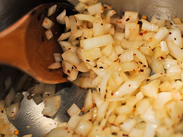 Heat oil and chili flakes in a medium saucepan over medium. When oil starts to bubble around flakes add in onion and cook until softened, about 5 minutes, stirring often. Add in ginger and garlic and continue to cook until fragrant, about 1 minute.
