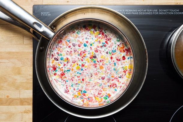 You got it? Yup—kid's cereal. Specifically, fruity cereal marketed to kids because it looks like brightly colored candy. Trix and Froot Loops certainly work in this recipe, but my personal go-to is the brightest, most artificially flavored of them all: Fruity Pebbles.