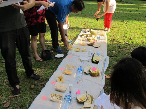 As a freelance food writer, I was lucky enough to be invited to an all-out fresh durian fest at a local durian tasting hosted by InSing.com. We sampled 11 durian cultivars (who knew there were so many?) with funky names like Red Prawn, Butter Durian, Mountain Cat, and D24. For details on that day, check out the Ultimate Durian Taste Test.
