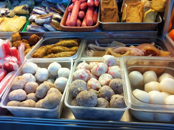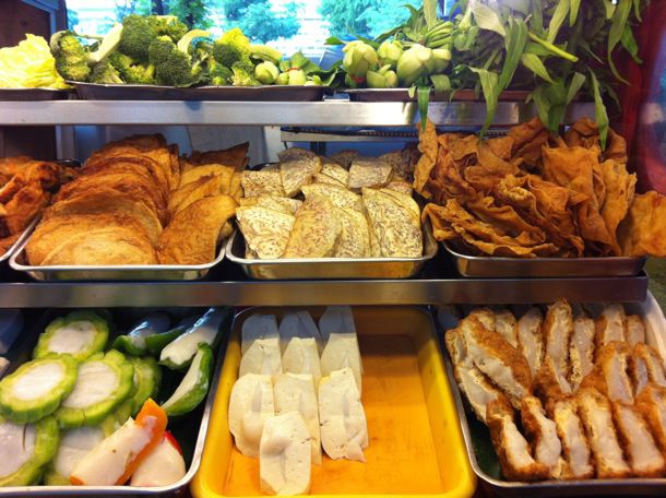 I usually go for the veggie and tofu items such as stuffed bitter gourd, stuffed chili, fried tofu, mushrooms, and cabbage. I pass up the mystery meats and cured squid option, and I always pop a hardboiled egg in my bowl if they have it.
