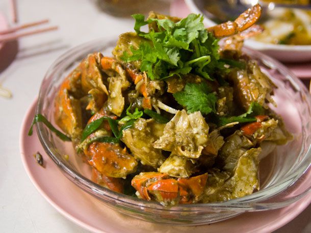 What many consider Singapore's national dish: crab in a sweet, spicy, eggy chili sauce made with onions, garlic, chili paste, plenty of oil, and the natural broth that forms from simmering the crab. It's best to wear a bib for this one; cracking the crab shells sends sauce flying. Leftover sauce is usually sopped up with fried mantou buns, or gets poured over noodles. You can find chili crab in hawker centers, but a local warned me that it's probably best to seek this dish out in a restaurant, where the crab is likely of higher quality. Wherever you find it, know that chili crab sauce can sometimes be on the sweet side. It's a great thing, but perhaps unexpected for Western seafood palates.