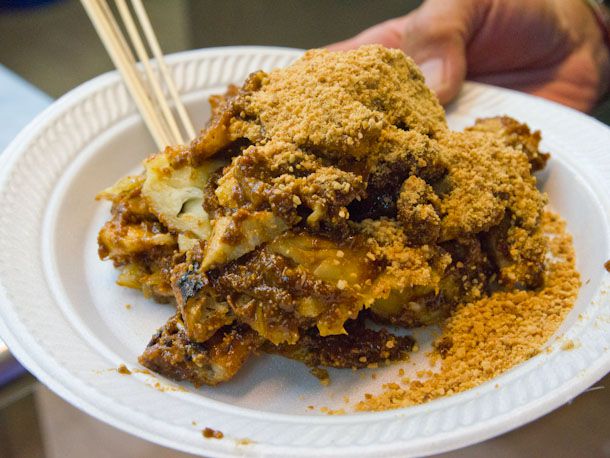 You'll find versions of this all over Indonesia and Malaysia, but in Singapore there are two spins: one with fruit, and one with battered, fried "stuff" like tofu, potato, egg, and shrimp. Both are covered in a thick, sweet sauce and a dusting of ground peanut. It's a prime example of how Singaporean food ignores the Western sweet and savory divide: a savory "salad," but with predominantly sweet flavors, and a crunch that's definitely not from lettuce.