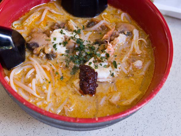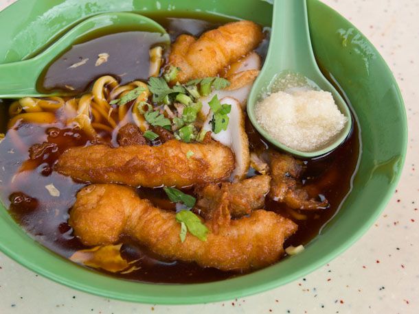 Lots of Singaporean dishes follow the protocol of "fill a bowl with noodles, top with stuff, add some chili paste, and maybe some broth." This is one of them, made with bouncy fish balls and slices of tender fish cake, with a sweet chili sauce and a bit of sweet-savory fish broth. Typical noodles include the linguine-like flat ones you see here, but also thinner vermicelli strands.