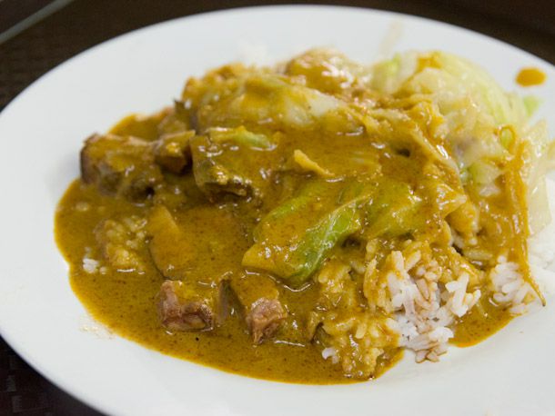 A dish that looks almost Japanese in origin, and if you've tasted Japanese curry that'll give you a sense of what to expect: a sweet, thick curry sauce rich with the musk of turmeric, topping simple steamed rice. Hainan curry rice is a Singaporean specialty, usually served with a pork chop, chicken, crisp, or fried pork, and a side of preserved cabbage. (The photo above features pork belly and fresh cabbage.) Save room for this dish, in whatever form you find it.
