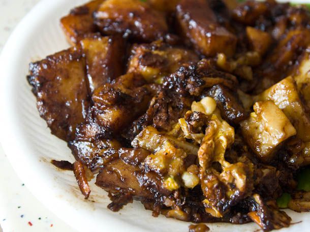 A delicious misnomer if ever there was one. This borrowed Teochow Chinese dish griddles up eggs with chunks of daikon radish cake (the kind you see at dim sum). There are two versions: a lightly seasoned one that tastes almost American brunch-like, and this dark one, saturated with molasses-like dark, sticky soy sauce. The egg and the daikon cake share crisp exteriors and soft, custardy insides. A breakfast of champions, this.