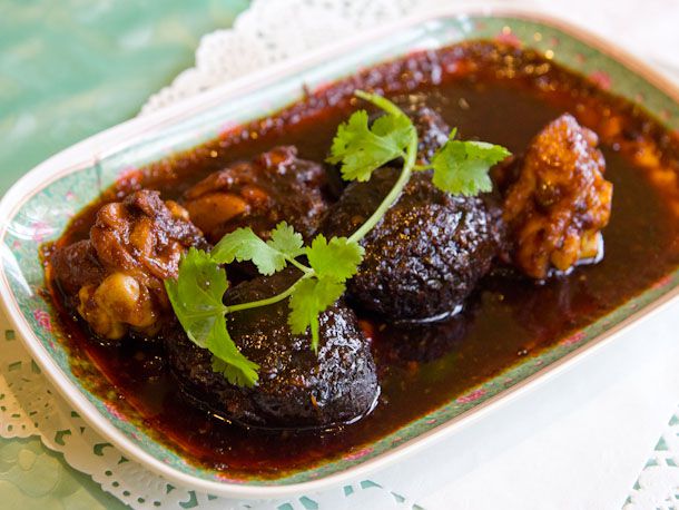 I fell in love with this Peranakan chicken dish, a braise of chicken and keluak nuts in a sweet, sour, funky, and smoky sauce built on keluak nut meat, tamarind, and stir fried chili paste. Keluak nut meat tastes like an extra-meaty, slightly smoky olive. You use something like a crab fork to pull them out from their clamshells, swipe them through the intense sauce, and eat them with a bit of chicken.