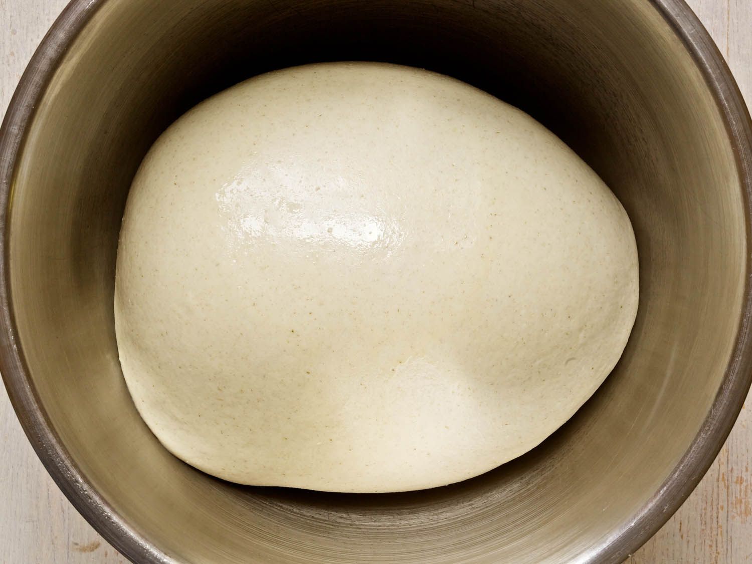 Grease a medium bowl with 5 grams olive oil. Turn dough out onto a work surface and knead it a few times to form a smooth ball. Put it in the prepared bowl and turn it over so top of dough is lightly coated with oil. Cover with plastic wrap and leave at room temperature for 2 hours, until doubled in size.