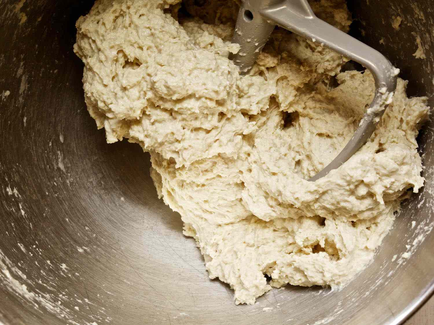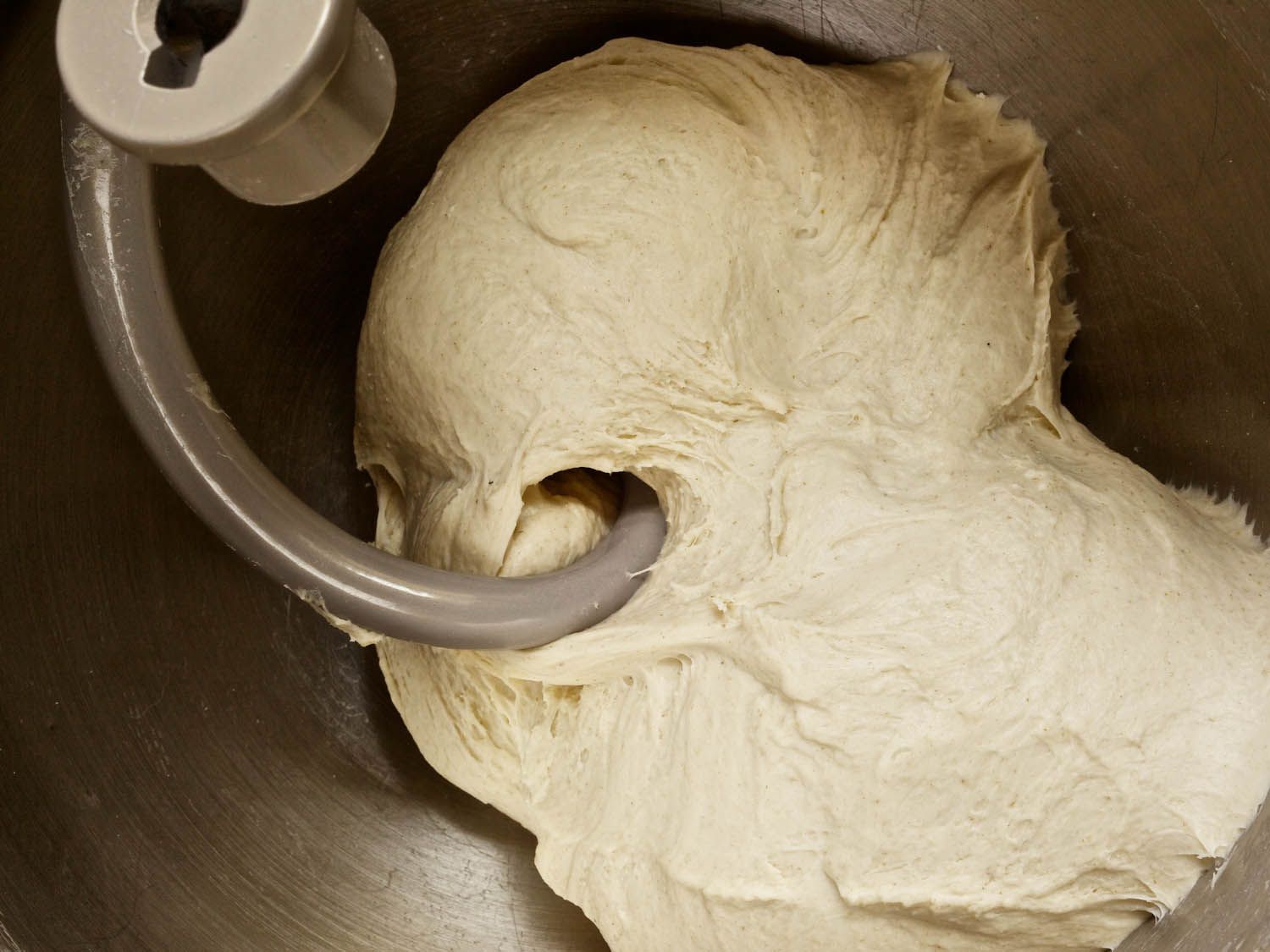 Switch to the dough hook mixing at low speed until dough begins to wrap around the hook. Increase speed to medium-low and knead until dough forms a smooth, uniform ball that wraps around the dough hook, 3-4 minutes; it may break apart into a few pieces at first, but will slowly adhere to one another creating a uniform mass.