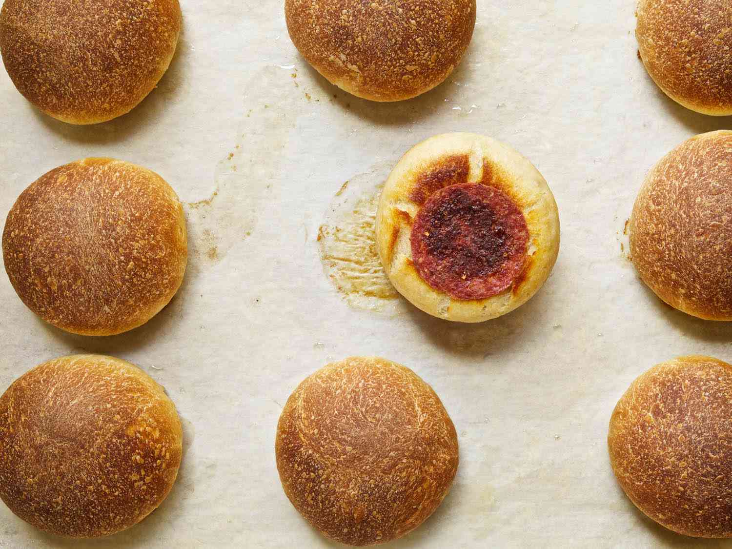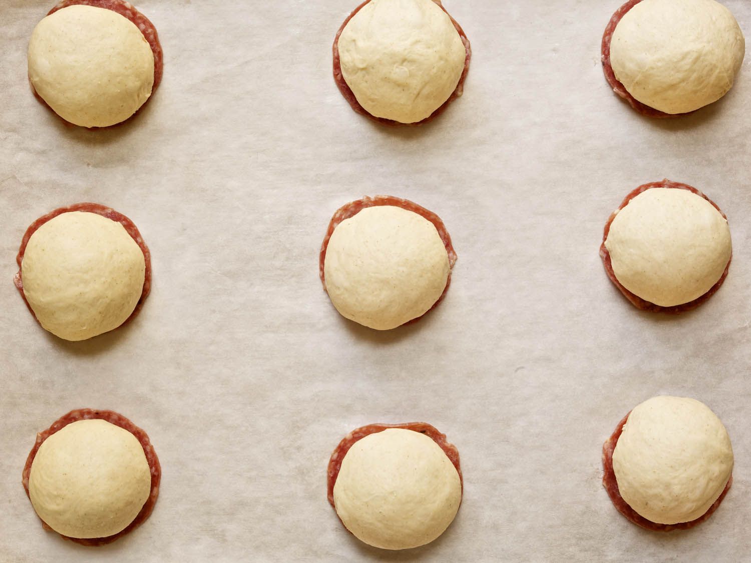 Line 2-3 baking sheets with parchment paper. Set slices of salami 4 inches apart on prepared baking sheets pans. Portion dough into 20 smooth balls, approximately 65 grams each. Set each dough ball on a salami round.