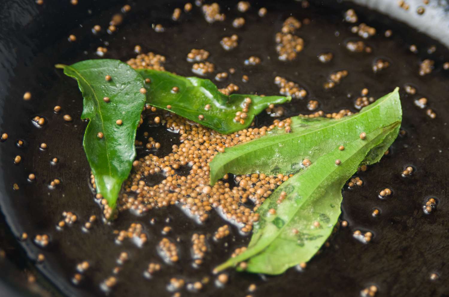 Heat oil in a medium skillet over medium high heat until shimmering. Add mustard seeds and curry leaves, coat with oil, and cook until the mustard seeds begin to crackle and pop, 1 minute or less. Immediately remove from heat and add to blender. Stir mixture together until well combined, then serve immediately.