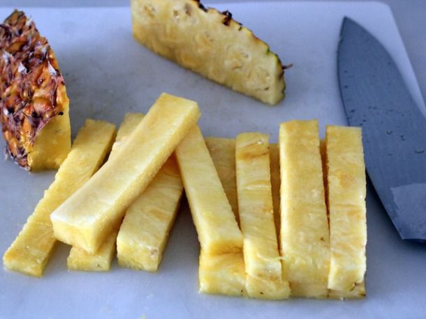 Peel and core the pineapple and slice the pineapple to yield 12 equal pieces that are each roughly the same size as the Spam slices (about 1/2-inch thick, 1/2-inch wide, 4-inches long). You will only need about half the pineapple pieces. Reserve the other half to serve with the spring rolls.
