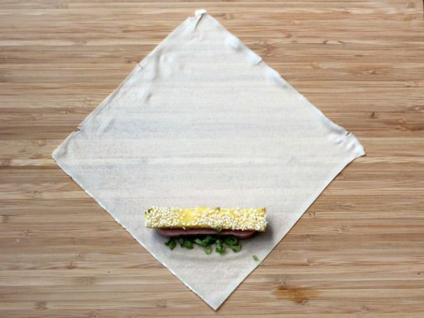 Place 1 spring roll wrapper on a clean, dry work surface so that one corner of the wrapper is pointing at you (positioned like a diamond, rather than a square). Place a Spam slice, a sesame-coated pineapple slice, and some of the sliced green onions just under the midpoint of the diamond, closest to the corner pointing at you.