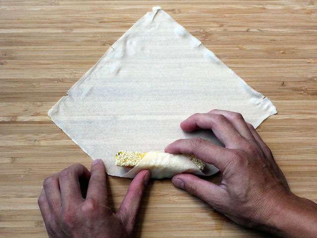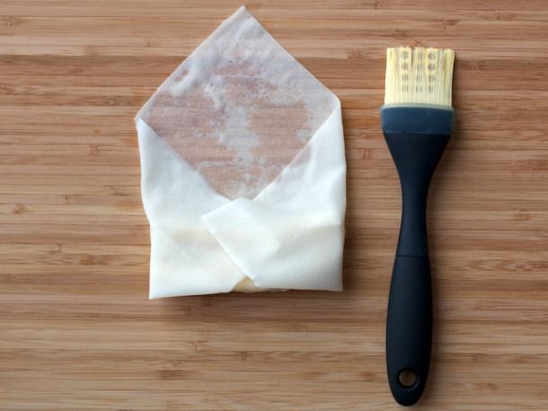 Take the corner closest to you and roll it up and over the filling, until half of the wrapper remains.