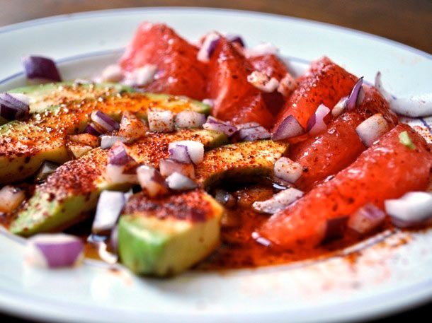 Chiles can be added to citrus salads, such as the avocado and grapefruit salad pictured at the top, in citrus-forward salsa, and with ceviche. To tame the heat and sourness you may want to look toward something sweet. A segmented grapefruit with some chile-infused honey is one of my favorite January breakfasts.