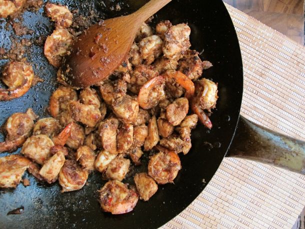 Add chicken to pan. Increase heat to medium-high and cook, stirring, for 2 minutes. Add shrimp and any accumulated juices to pan. Continue to cook, stirring, until both chicken and shrimp are cooked through, edges are caramelized, and sambal mixture is deep golden, 2 to 4 minutes more. Season to taste with salt. Serve with steamed rice on the side.