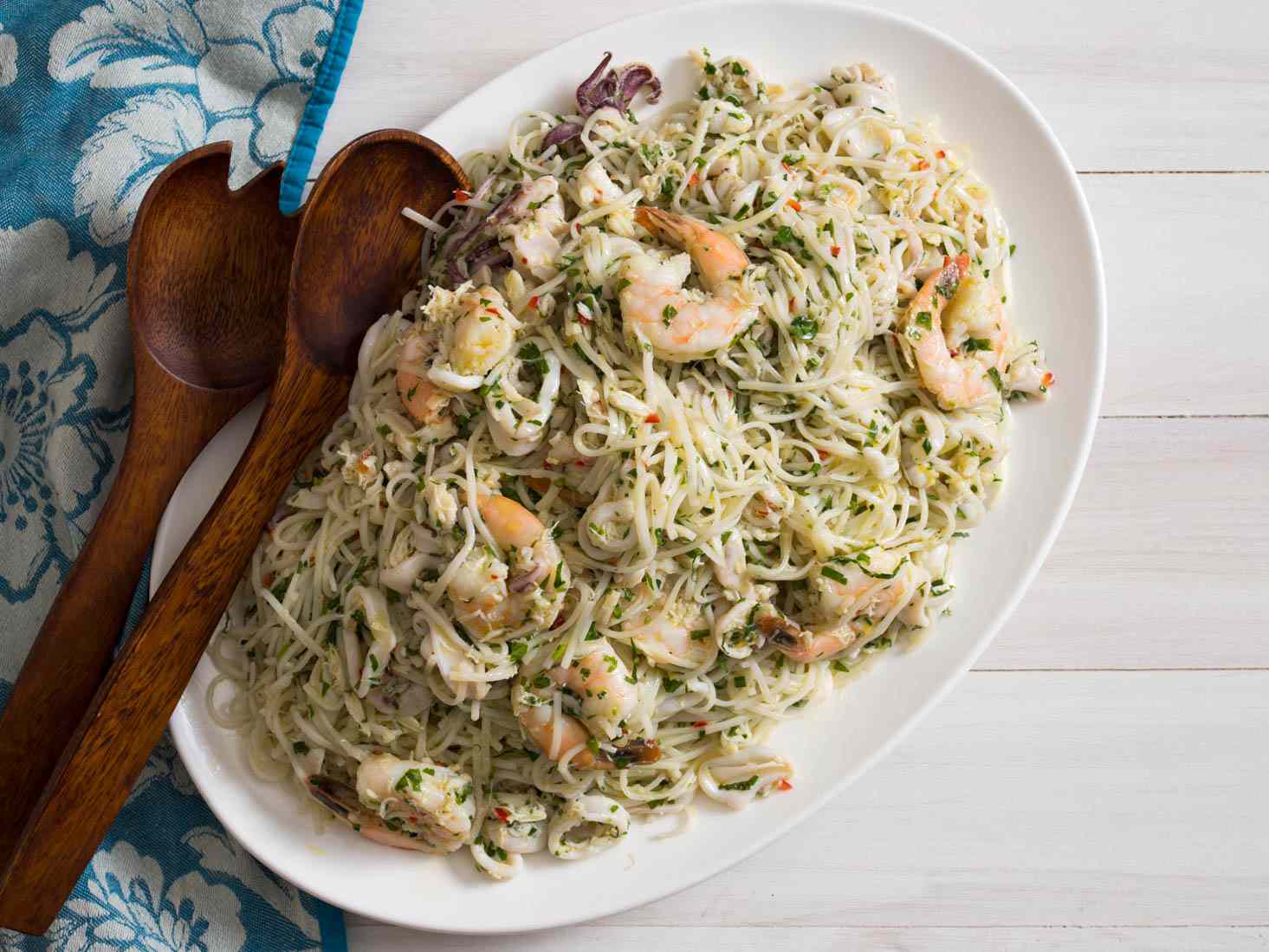 Two classic dishes—Italian-style seafood salad and refreshing pasta salad—collide in this summer dish, bright with lemon and olive oil. The secret is in the selection of pasta: Asian rice noodles deliver the perfect texture and flavor-absorbing powers to make every bite taste like pure seafood-salad bliss.