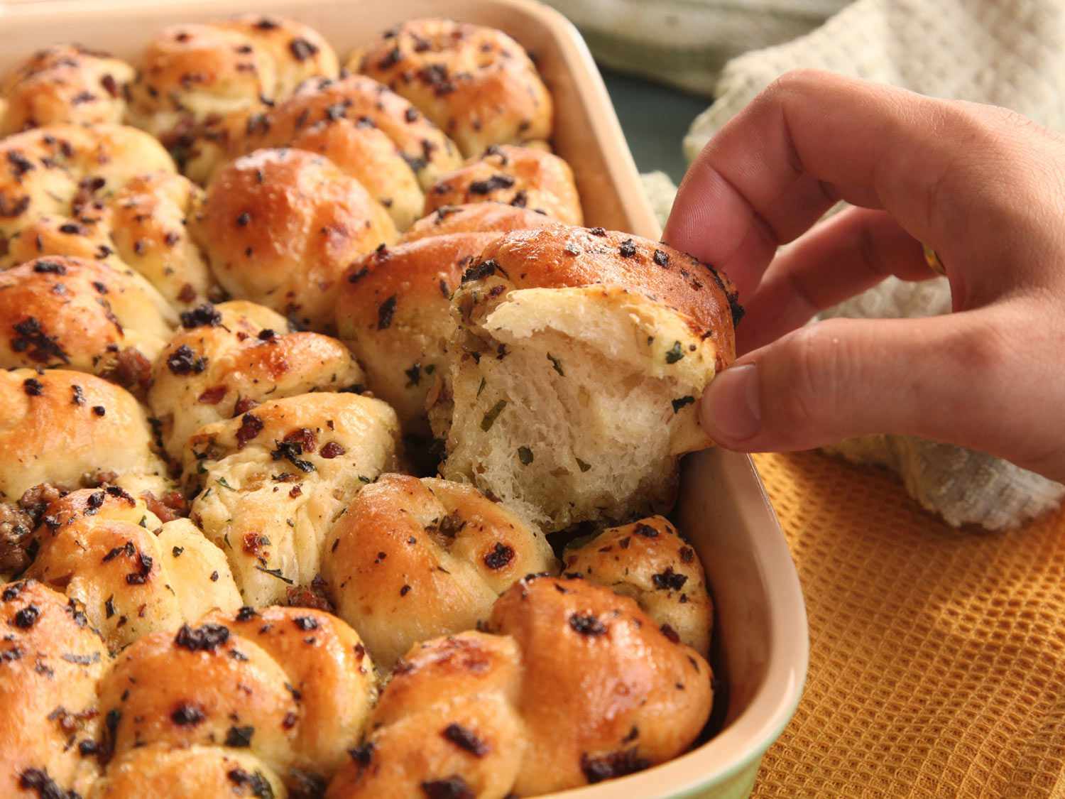 Rolls are often thought of as more of a secondary player in a meal, but these have enough flavor to be a star in their own right thanks to classic stuffing ingredients like sausage, celery, and sage. They are also super easy—with so many intense ingredients, we have no problem using slightly bland store-bought pizza dough instead of making the dough from scratch.